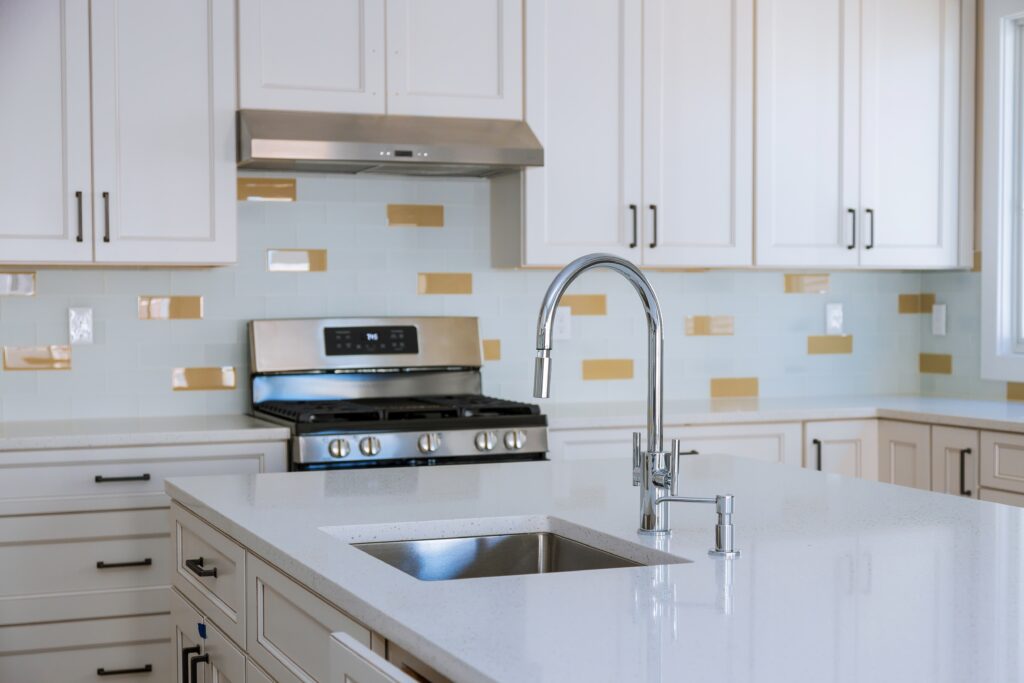 ← Previous image Next image → Modern domestic cabinets with new appliances and sink in kitchen Modern domestic kitchen cabinets with new appliances and sink in kitchen